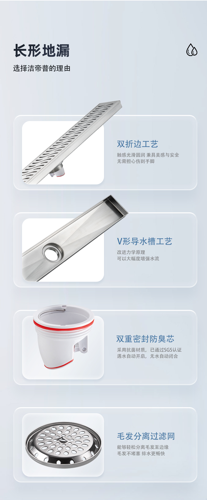 核心工藝:15度V形導水槽設計,秒速排水,創(chuàng)新設計帶來強勁實力;
