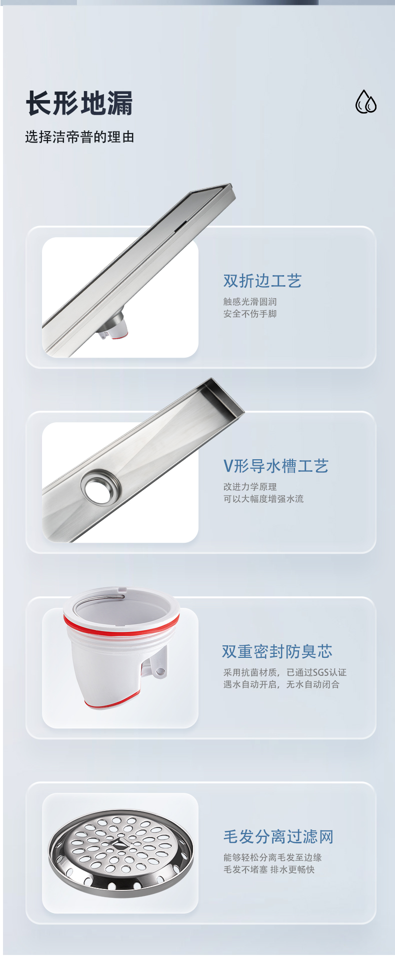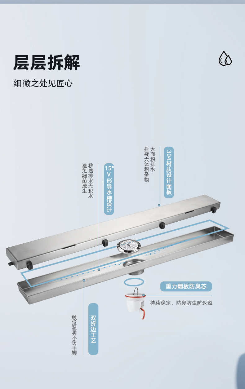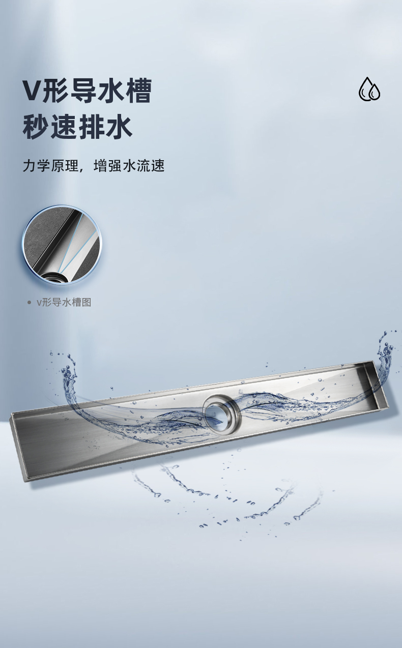 核心工藝:15度V形導(dǎo)水槽設(shè)計,秒速排水,創(chuàng)新設(shè)計帶來強勁實力;