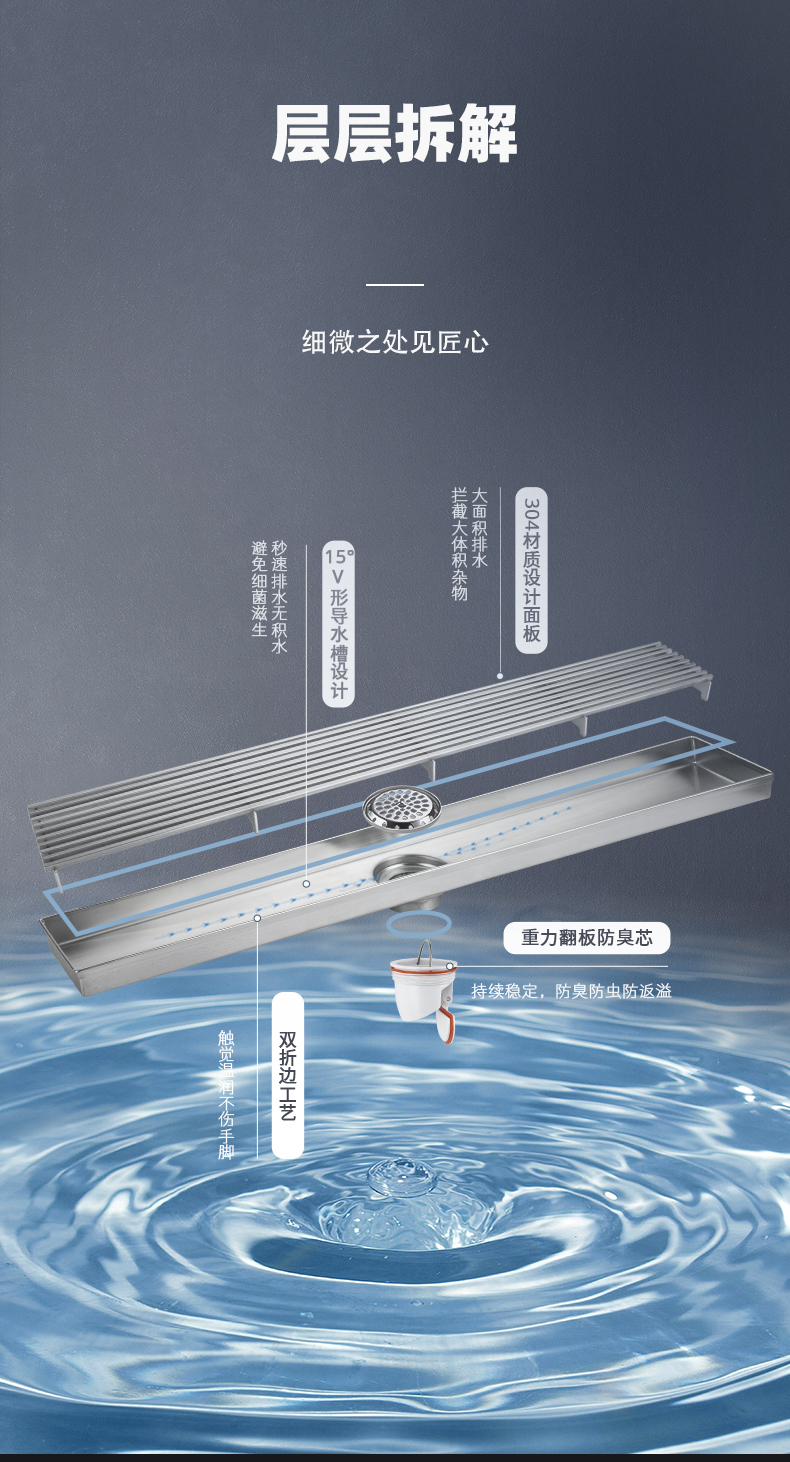 核心工藝:15度V形導(dǎo)水槽設(shè)計,秒速排水,創(chuàng)新設(shè)計帶來強勁實力;